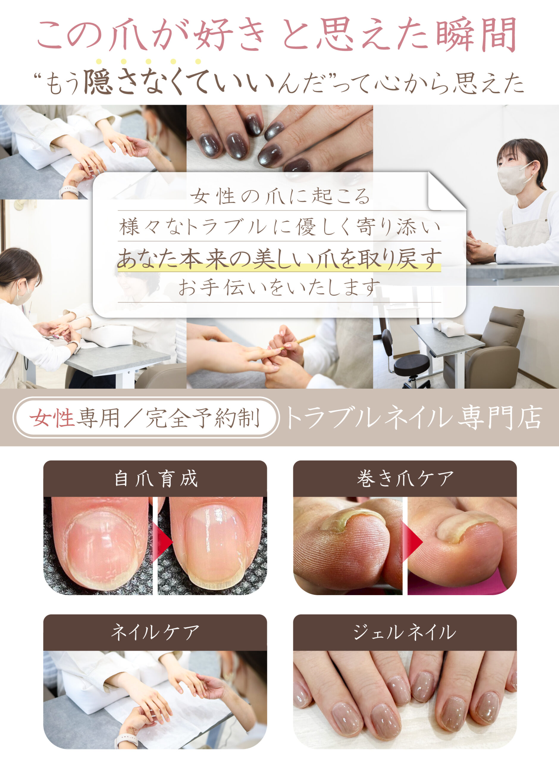 深爪、二枚爪、巻き爪、薄い爪…様々なトラブルを抱えた方々が、本当は指先を綺麗にしたい気持ちを押し殺してネイルを諦めてしまう。どのサロンに行っても満足できず、かといって自分ではどうにもできず、行き場のない悩みを抱えている――万丈はそんな女性たちを何人も目の当たりにしてきました。「おしゃれはもういいから普通の爪に戻したい」「人前でも恥ずかしくない手元にしたい」という切実な願いに応えられる場所がない現実に心を痛め、「自爪に悩みを持つ人の駆け込み寺のようなサロンが必要だ」と考えるようになったのです。