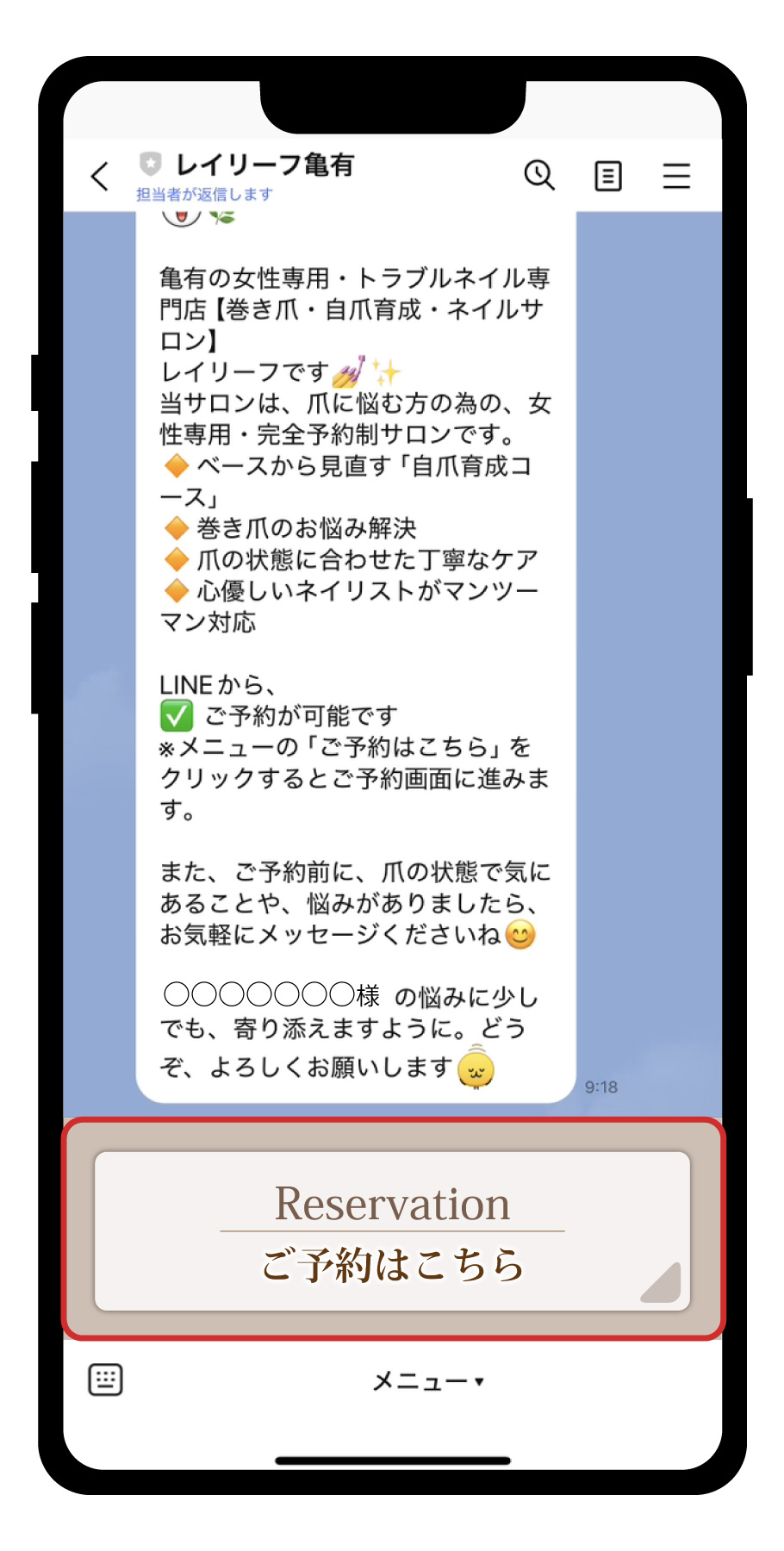 LINE登録後、メニューの「ご予約はこちら」よりご予約ください。