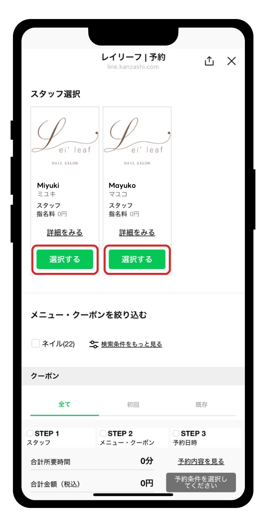 予約画面が表示されますので、スタッフとメニュー「爪の相談+お試しケア:2,980円(税込)」を選んでご予約をお願いします。