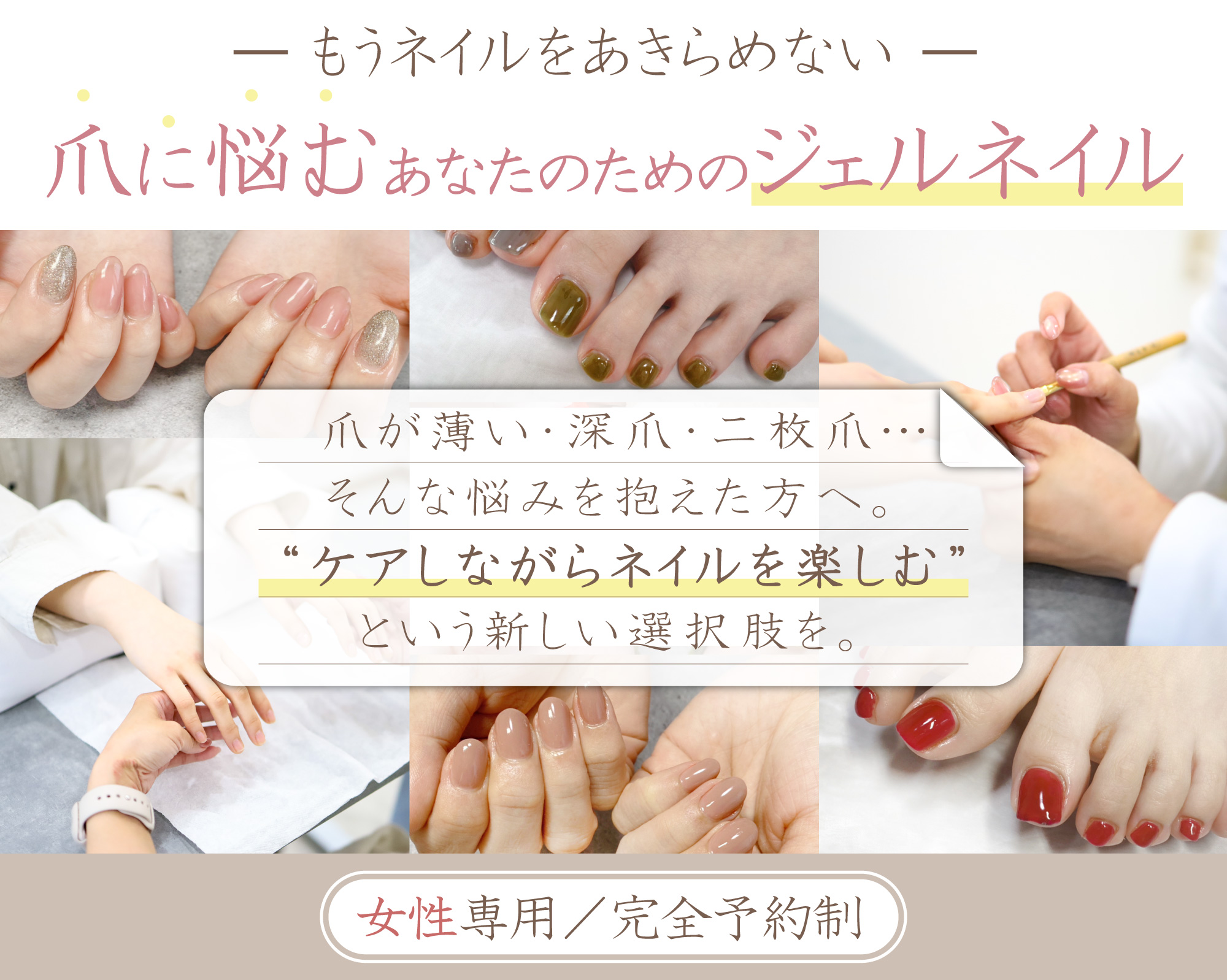 私たちはこの業界の課題に正面から向き合い、爪の悩みを持つ全ての方に安心して通っていただける場所を目指しています。